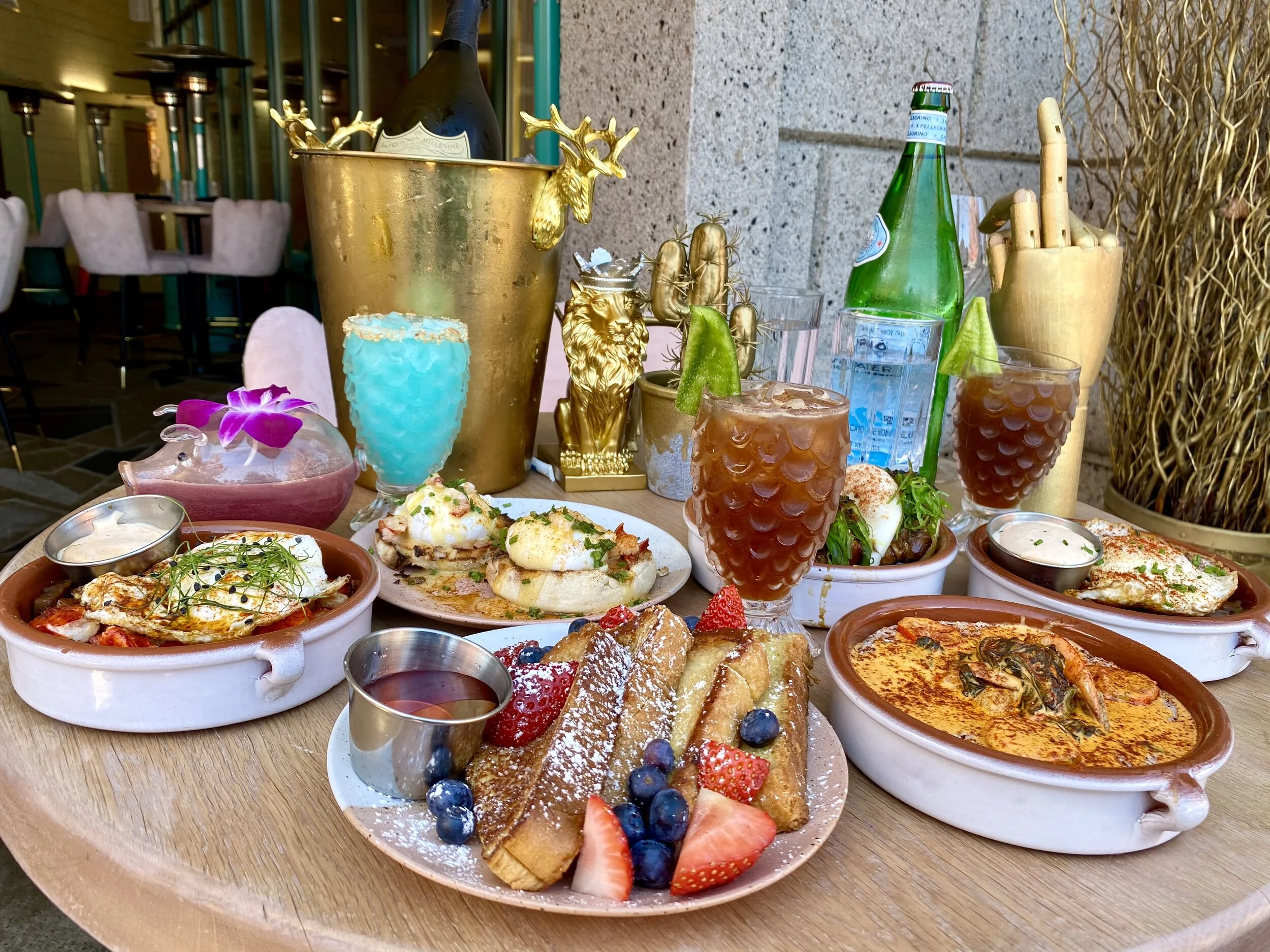 The food is no slouch either with decadent lobster scrambled eggs duck confit eggs Benedict red velvet waffles and a Tex-Mex style steak and eggs.