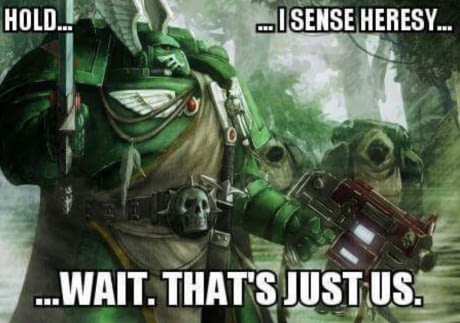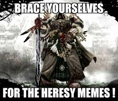 It is commonly associated with Warhammer 40000 and has been the subject of numerous image macros. So Heresy is a catch-all term amongst Warhammer players that can mean a few different things.