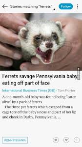 When he and Benales came downstairs the baby was screaming and they found the ferrets had eaten away 25 percent of her face. While standard ferrets arent guaranteed to have great genetic health non-standard ferret types are often indicative of poor health. A one-month-old baby was viciously attacked by three ferrets on the morning of January 23 in the Darby Township in Pennsylvania south of.